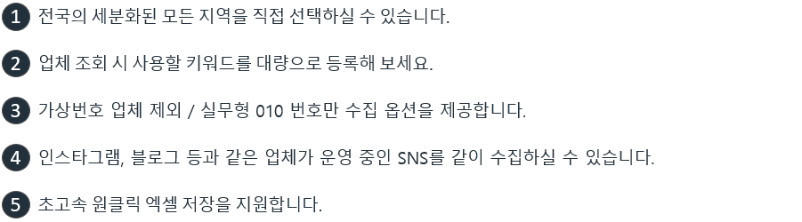 해당 지역에 등록되어 있는 업체의 상호명, 업종, 연락처, 주소를 기본적으로 가져오며,